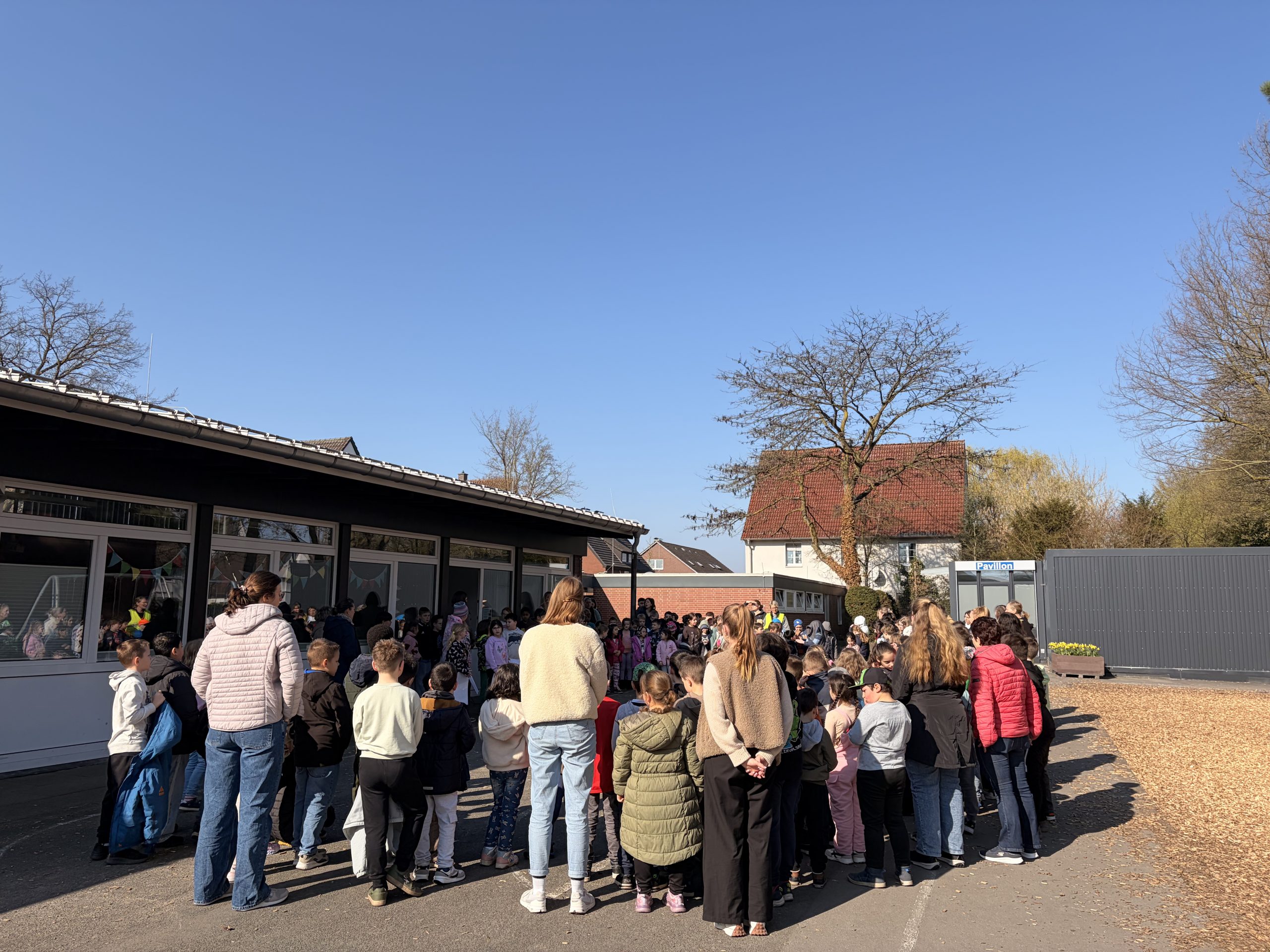 Am heutigen Mittwoch trafen sich alle Kinder, Lehrerinnen und MitarbeiterInnen, einen Tag vor dem offiziellen Frühlingsbeginn, auf dem großen Schulhof zum traditionellen, gemeinsamen Jahreszeitensingen. Nach