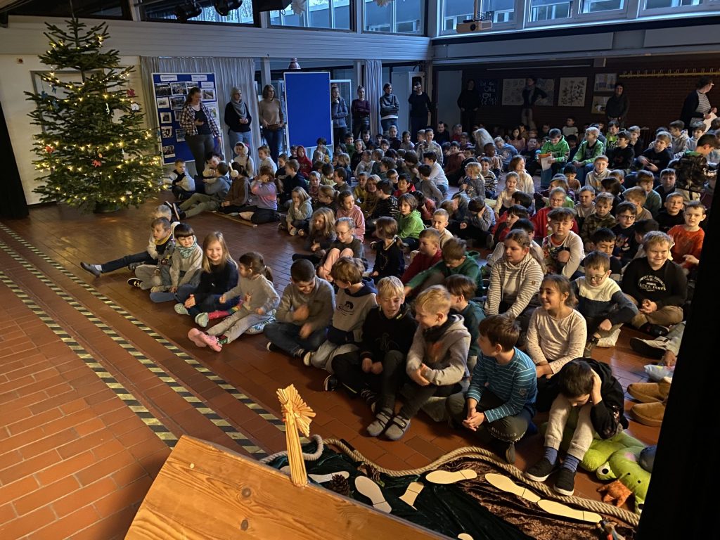 Traditionell findet am Montagmorgen in der 1. Stunde, dann wenn es im Dezember um 8.00 Uhr draußen noch dunkel ist,  eine Adventsfeier in der Aula statt. In diesem Jahr haben wir von der Stadt Rheda-Wiedenbrück einen besonders prächtigen Weihnachtsbaum gespendet  bekommen. Mit Lichterkette und selbstgebastelten Anhängern liebevoll von den Schüler:innen geschmückt, lässt er die Stimmung in der Aula so wunderbar adventlich werden. In dieser vorweihnachtlichen Atmosphäre wird gemeinsam gesungen, Texte werden – ob lustig oder nachdenklich- von einzelnen Klassen vorgetragen und zum Schein der Kerzen wird ein Lichtertanz präsentiert. Die Feier wurde von einem Schüler und einer Schülerin aus der Klasse 3b gekonnt moderiert.  In so einem gemütlichen Rahmen rückt man gerne mal näher zusammen, da entsteht ein Zusammengehörigkeitsgefühl und das ist die beste Voraussetzung für Frieden. Frieden ist das, was wir in der Welt am dringendsten brauchen.  In der Schule dieses „friedliche Miteinander“ zu erleben, ist doch schon mal ein hoffnungsvoller Anfang.