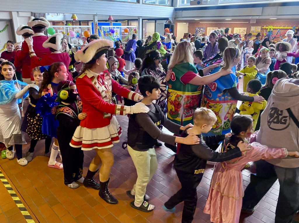 Auch die Prinzessin richtete Worte des Grußes an uns, um im Anschluss ausgelassen mit uns zu tanzen und zu feiern. Das war, wie immer, das Highlight der Karnevalsfeier in der Regenbogenschule. Der Piratentanz, das Fliegerlied und das rote Pferd sind die Klassiker, die bei keiner Karnevalsparty fehlen dürfen. Natürlich gab es auch eine Polonaise, süße Geschenke für das Kinderprinzenpaar sowie eine Stärkung für die Großen und Kamelle für alle.