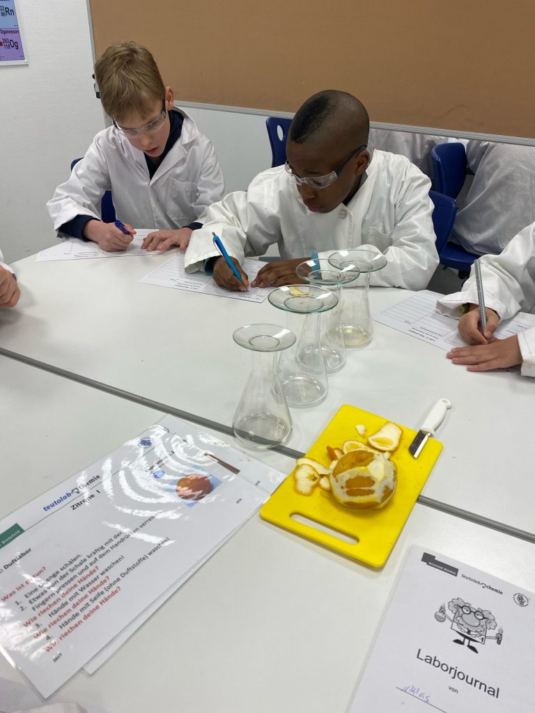 Auch in diesem Jahr durften die SchülerInnen der Klassen 3a und 3b wieder zum Kennenlernen naturwissenschaftlichen Unterrichts  im Rahmen des MINT-Projekts unsere Kooperationsschule, die Osterrath-Realschule in Wiedenbrück für einen Schulvormittag besuchen. Für die  SchülerInnen der Regenbogenschule ist dabei  das Ziel,  die Begeisterung für naturwissenschaftliche Themen aufzubauen ( MINT- Mathematik, Informatik, Naturwissenschaften), für die SchülerInnen des 9. Jahrgangs der Osterrath-Realschule steht die Vermittlung von Kompetenzen zur  Durchführung naturwissenschaftlicher Experimente im Vordergrund ihrer Lernentwicklung. Beide Schülergruppen mitsamt den Lehrkräften können von dieser Kooperation nur profitieren. Optimale Rahmenbedingungen, wie ein gut ausgestatteter Chemieraum, eine passende Ausrüstung mit Schutzbrillen und weißen Kitteln und eine beachtenswerte Auswahl an eindrucksvollen Experimenten  ermöglichen die didaktischen Lernanliegen der naturwissenschaftlichen Methoden nachzuvollziehen.  Insgesamt vier verschiedene Stationen  im Rotationsprinzip mit alltagsnahen Themen boten die Möglichkeit, neue Lernerfahrungen zu machen. Unter fachkundiger Anleitung durch die SchülerInnen der 9. Klassen konnten die  SchülerInnen der Regenbogenschule selbstständig handelnd eigene Experimente durchführen.  In eingerichteten Laboren – einem Duftlabor, zwei Säurelaboren und einem Zauberlabor – experimentierten die Drittklässler,  sammelten dabei wichtige naturwissenschaftliche Erfahrungen und hatten viel Spaß an naturwissenschaftlichen Methoden. Ein gelungener Schulvormittag und eine wunderbare Win-win-Situation für beide Schulen. Wir freuen uns schon auf das nächste Jahr.