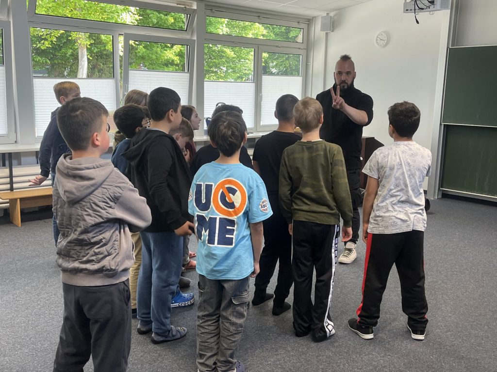 Im Mai nahmen die Kinder der 3. Klassen wieder am Projekt „Stark auch ohne Muckis“ teil. Dieses Projekt setzt sich ein gegen Mobbing, für selbstbewusste Kinder und für den Umgang mit Konflikten, wie Streitereien oder Beleidigungen im Alltag. Zunächst lernten die Kinder, wie man mutig und selbstbewusst wirkt und steht. Dabei wurde eindrucksvoll gezeigt, dass man dann nicht mehr so leicht „umzuschubsen“ ist. In mehreren Situationen und spielerischen Übungen wurde der Umgang mit Provokationen besprochen und geübt. Nach dem Motto: Reagiere auf eine Provokation der „Mücke“ niemals meckernd wie ein „Schaf“, sondern bleibe ruhig wie ein „Löwe“. Diese Bilder ermöglichen eine Vertiefung und Weiterführung im Unterricht und im schulischen Alltag. Hören wir nun in einer Pause, wie K. seinem Freund A. in einer Streitsituation den folgenden Tipp gibt: „Sei ein Löwe!“, und sich die Situation entschärft, dann wissen wir, es hat sich gelohnt. Wir danken für die Finanzierung durch den Förderverein der Schule und einer großzügigen Spende.