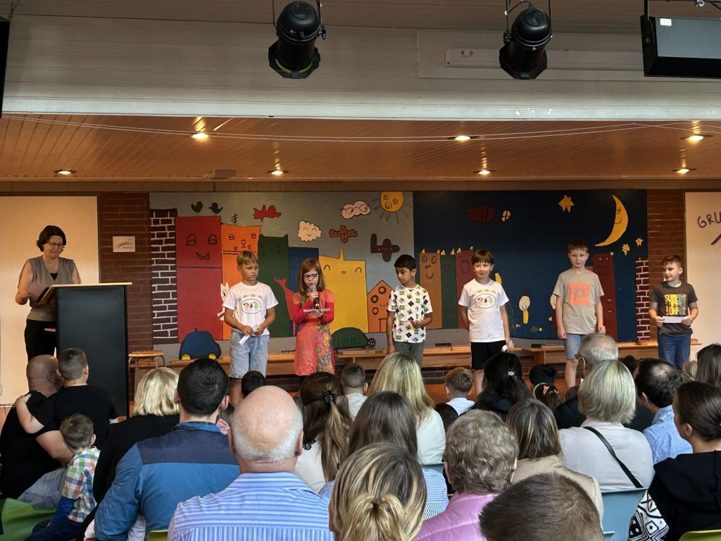 Die (kommissarische) Schulleiterin, Frau Jung, begrüßte gemeinsam mit 6 SchülerInnen die SchulanfängerInnen und ihre Familien. Die 6 „alten Hasen“ machten den neuen Kindern Mut, denn sie alle haben vor nicht allzu langer Zeit genauso wie „die Neuen“ angefangen und heute stehen sie schon auf der Bühne und sprechen vor der voll besetzten Aula. Das war großartig! Auch Kewin, unser Schülersprecher, fand aufmunternde Worte.
