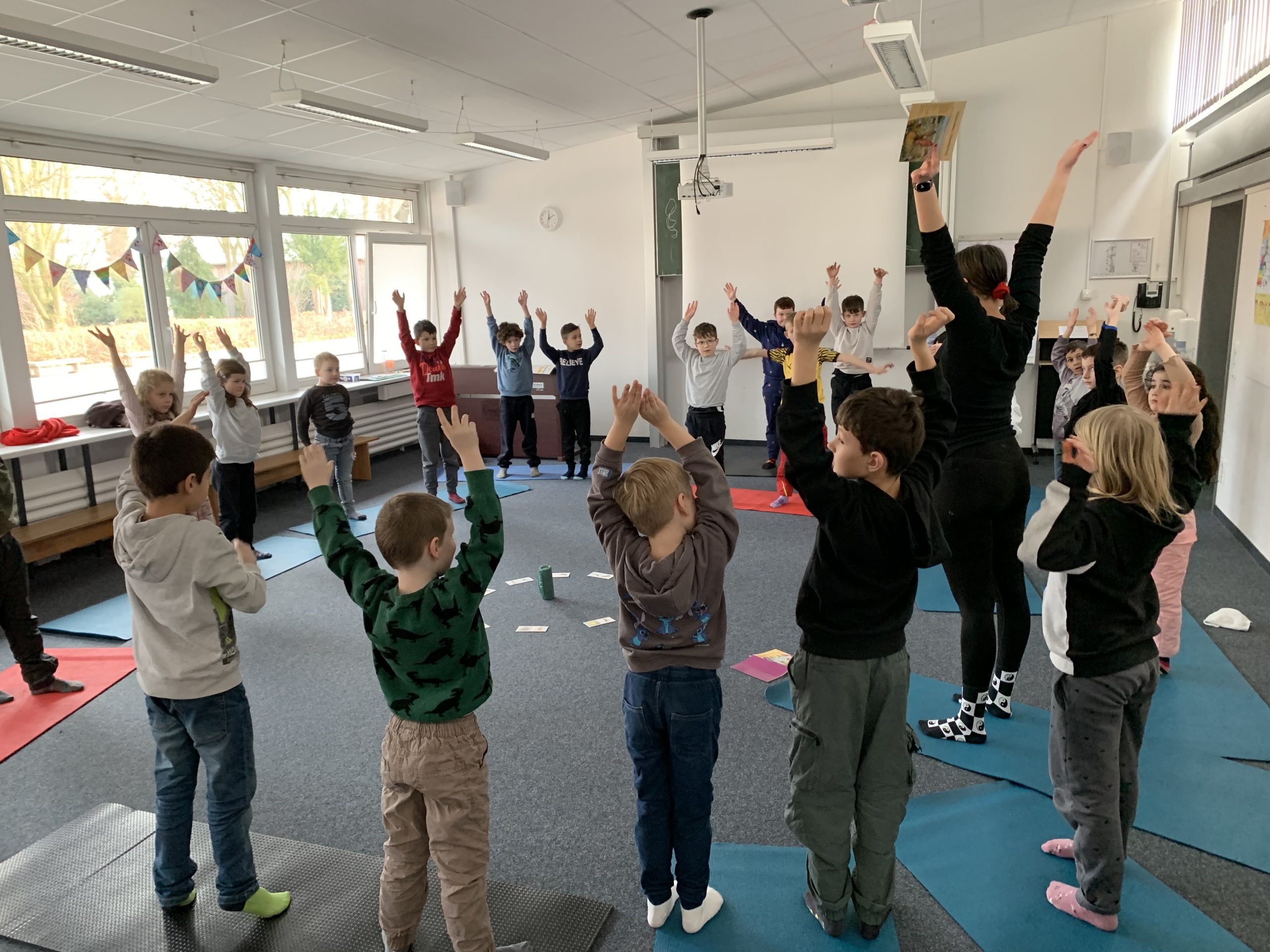 Der Projekttag zum Thema „Gesundheit“ startete mit Bewegungsliedern in der Aula mit der ganzen Schule. Mit Energie und guter Laune begannen wir also den Tag! Danach ging es direkt in die Lehrküche. Wir machten 2 Smoothies (Himbeer-Orange-Joghurt & Spinat-Apfel-Banane) und ließen uns diese schmecken. Zurück in der Klasse ging es um das Erleben von „Obst und Gemüse“ mit allen Sinnen. Zum Schluss entspannten wir uns noch mit Kinder-Yoga!