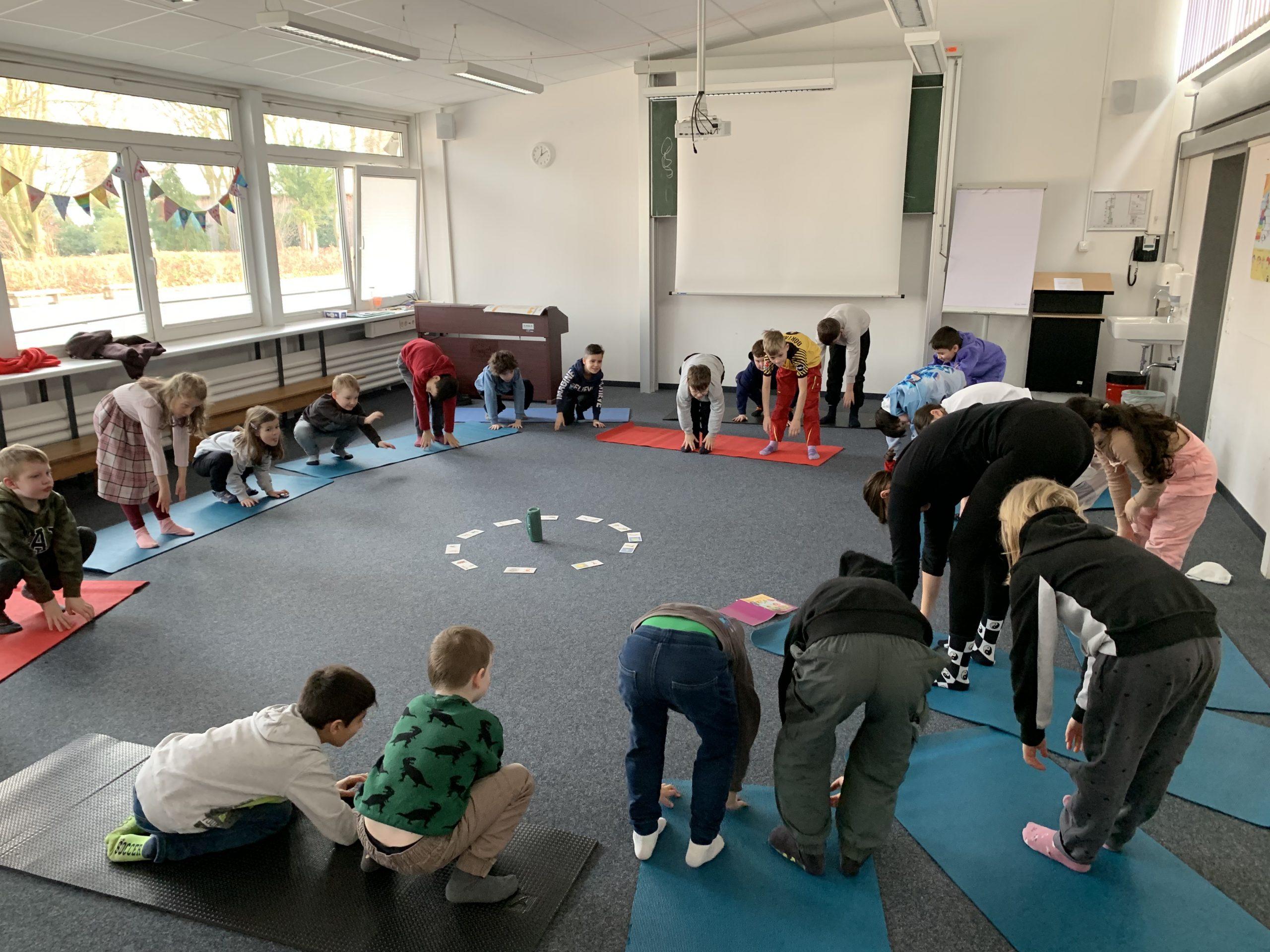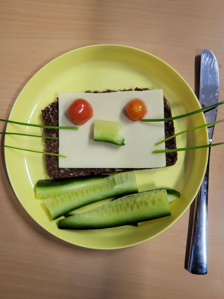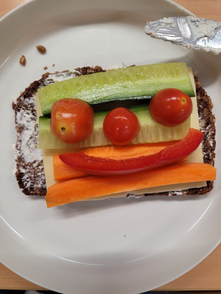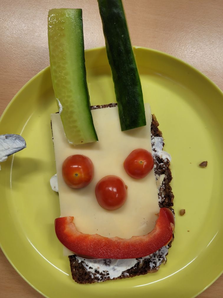 Begonnen hat unser Tag mit einem Warm-Up-Tanz in der Aula. Das war toll! Danach haben wir uns die Ernährungspyramide angeschaut und selber zusammen gepuzzelt. Passend dazu haben wir uns ein gesundes Frühstück zusammen gestellt – es gab Gemüsegesichter auf Vollkornbrot! In der Frühstückspause stand unsere Brotdose auf dem Prüfstand. Wir haben überlegt, welche Teile der Ernährungspyramide in unserer Brotdose zu finden sind. Frisch gestärkt ging es dann zum Sport – wir trainierten unsere Beweglichkeit mit der Vorwärtsrolle! Zum Abschluss des Tages kamen unsere Gedanken beim Yoga zur Ruhe. Gemeinsam übten wir verschiedene Yogaübungen mit der Zebraklasse im Musikraum. Namaste – das war ein schöner Tag!