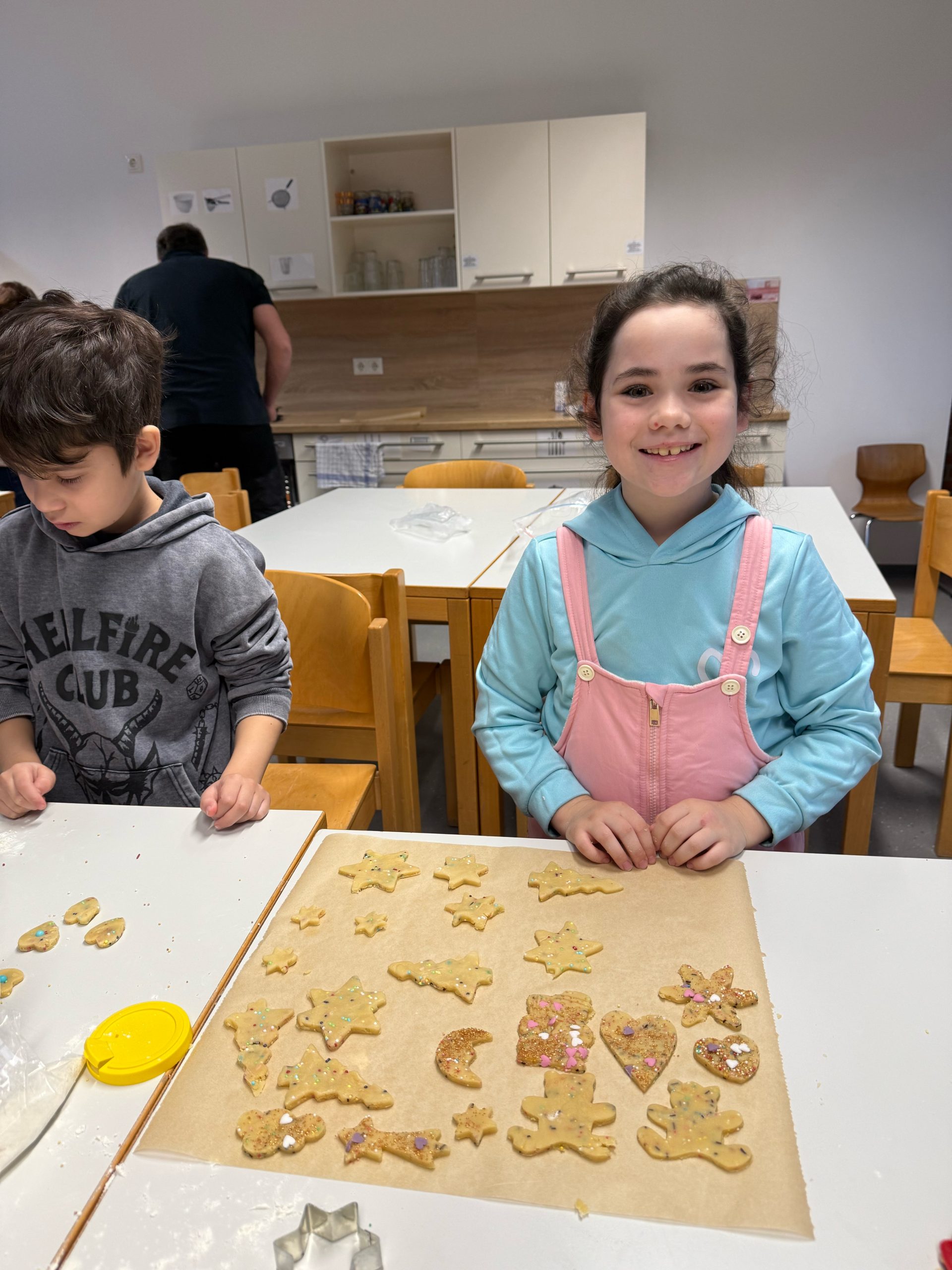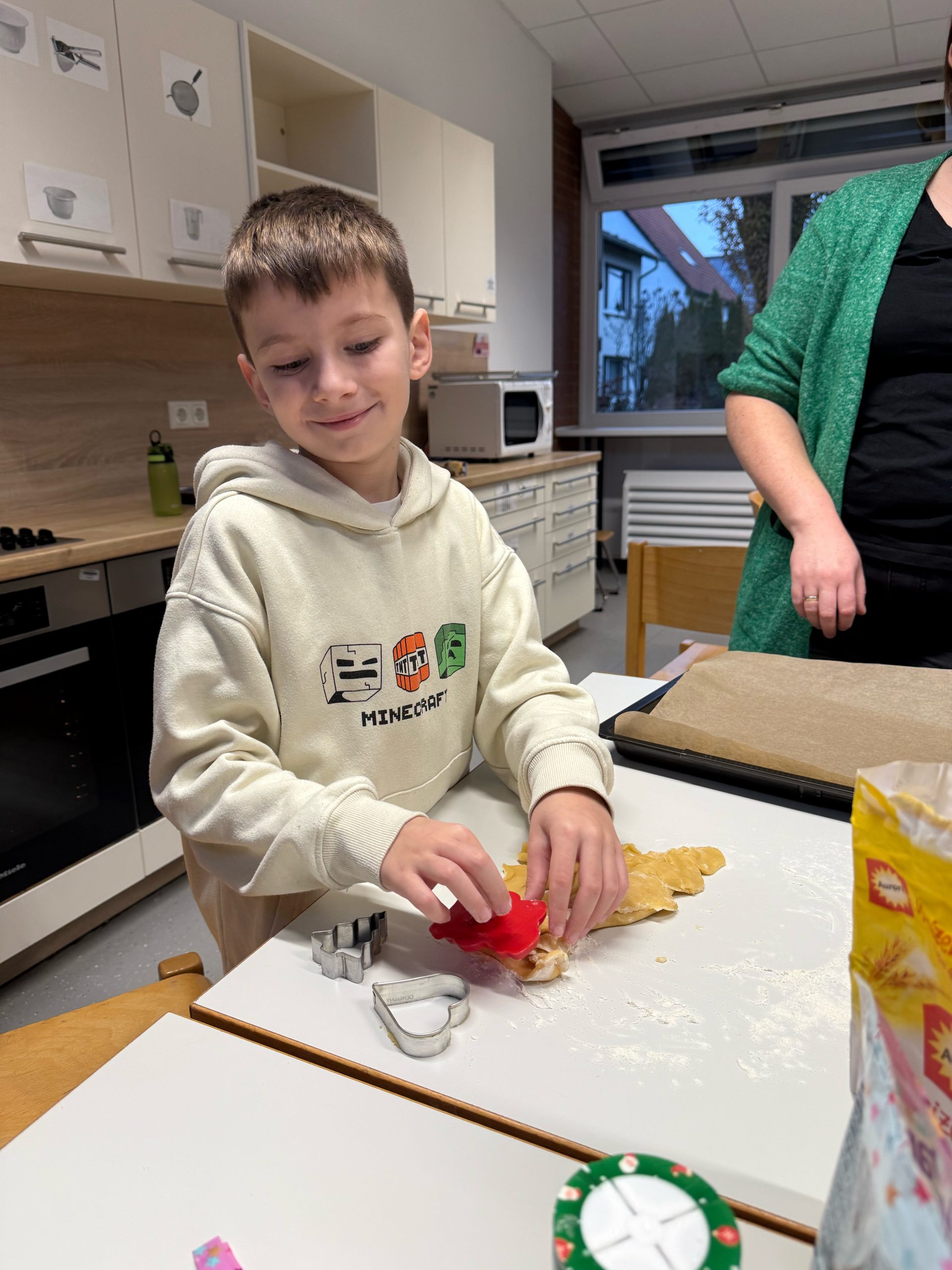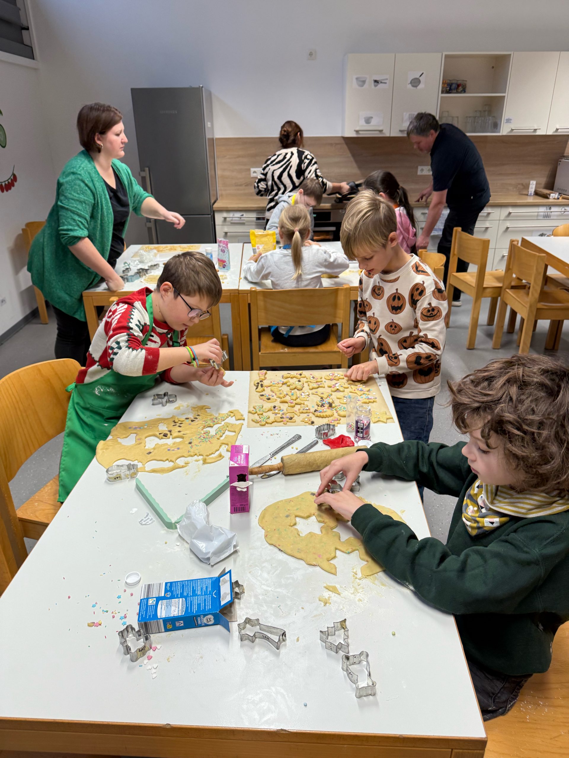 Im Dezember darf das Plätzchenbacken nie fehlen. Voller Vorfreude starteten wir in unseren gemeinsamen Backtag. Die Kinder der Hasenklasse brachten Plätzchenteig, Ausstecher und Streusel zum Dekorieren mit. Gemeinsam mit einigen Eltern backten wir dann ganz viele Plätzchen, die uns die gemeinsame Vorweihnachtszeit versüßten.