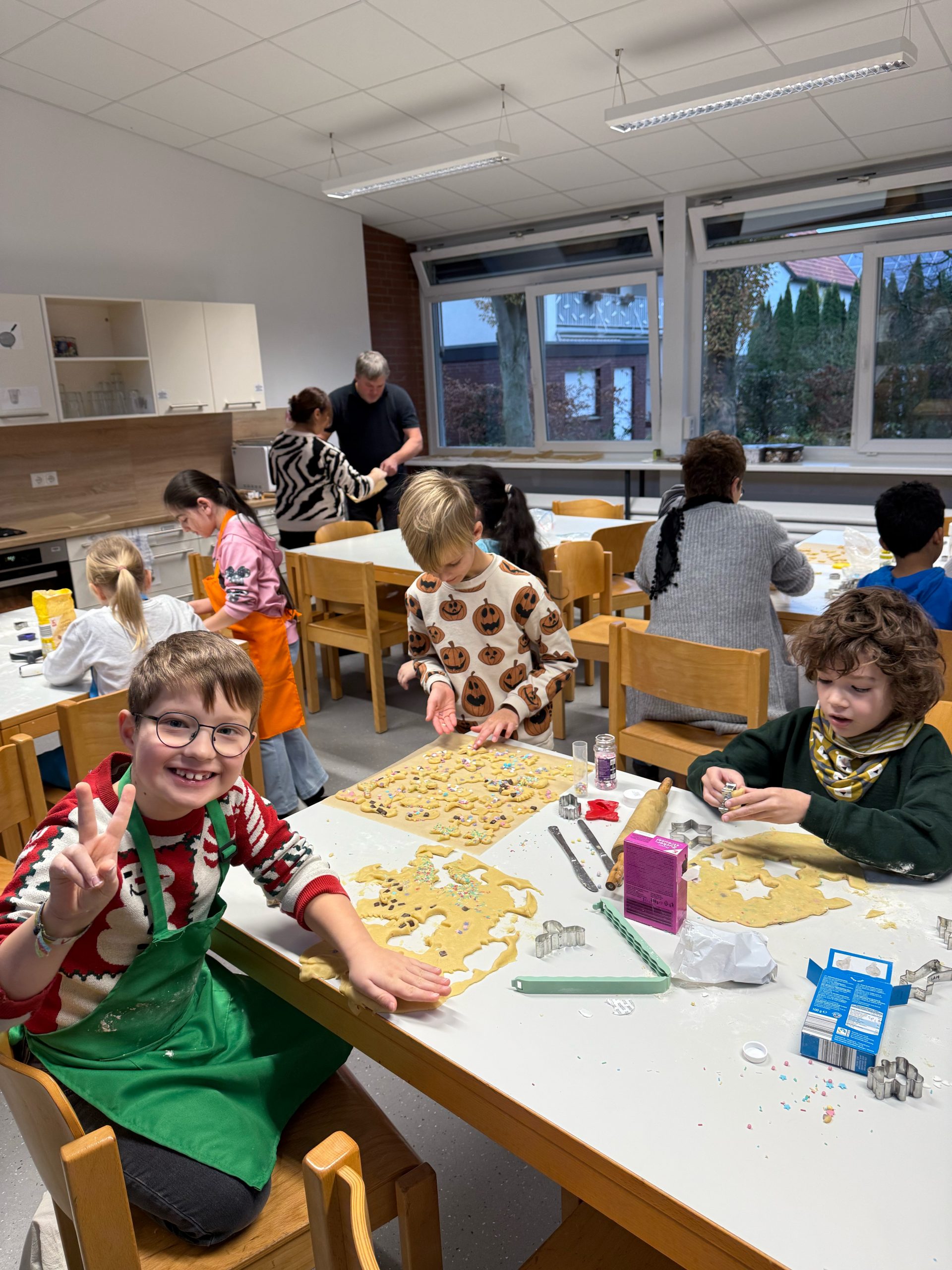 In Vorbereitung auf die anstehende Adventszeit haben wir am Mittwoch Plätzchen ausgestochen, gebacken, verziert und probiert. Lecker! Nebenbei stimmten wir uns mit Weihnachtsliedern auf die kommenden Wochen bis Weihnachten ein. Mit Keksen sind wir auf jeden Fall nun ausreichend versorgt. Wir hatten eine Menge Spaß und bedanken uns bei allen helfenden Eltern, die uns unterstützt oder mit Plätzchenteig versorgt haben!