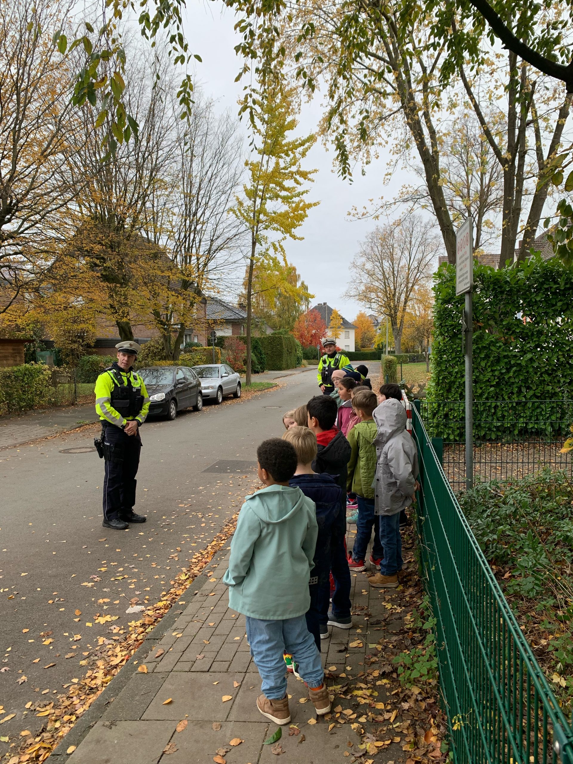Im Fach Sachunterricht lernen wir gerade alles rund um das Thema „Auf der Straße“. Dafür hat uns am 04. November die Polizei besucht. Gemeinsam lernten wir, was wir beim Überqueren der Straße beachten müssen. Wir durften sogar alleine und in Gruppen die Straße überqueren. Dabei achteten wir auf das genaue Schauen und das zügige Gehen. Die Merksprüche werden uns sicher gut in Erinnerung bleiben: Am Bordstand halt, sonst knallts! Nicht rennen und nicht pennen!