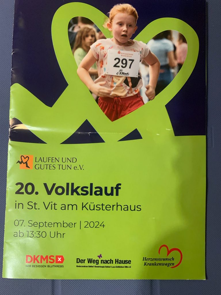 Schülerin der Regenbogenschule auf dem Siegertreppchen! Am Samstag, den 07. September reisten acht Schüler Schülerinnen der Regenbogenschule mit ihren Eltern zur Laufveranstaltung „Laufen und Gutes tun“ nach St. Vit. Mit Freude stellten wir fest, dass eine Schülerin unserer Schule mit ihrem Foto vom letzten Jahr auf dem diesjährigen Flyer abgebildet wurde. Bei super Sommerwetter starteten zuerst drei Schulanfänger auf der 430m Bambinistrecke für die Regenbogenschule und kamen glücklich ins Ziel. Zur Belohnung gab es einen Geschenketüte. Anschließend gingen vier Mädchen und ein Junge auf die 2,1 km Strecke. Hier konnte eine Schülerin sogar den 3. Platz bei den Mädchen unter 8 Jahren erreichen und wurde auf dem Siegertreppchen geehrt. Herzlichen Glückwunsch an alle Läufer und Läuferinnen!