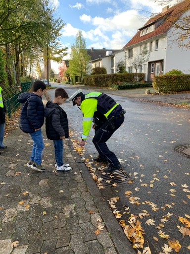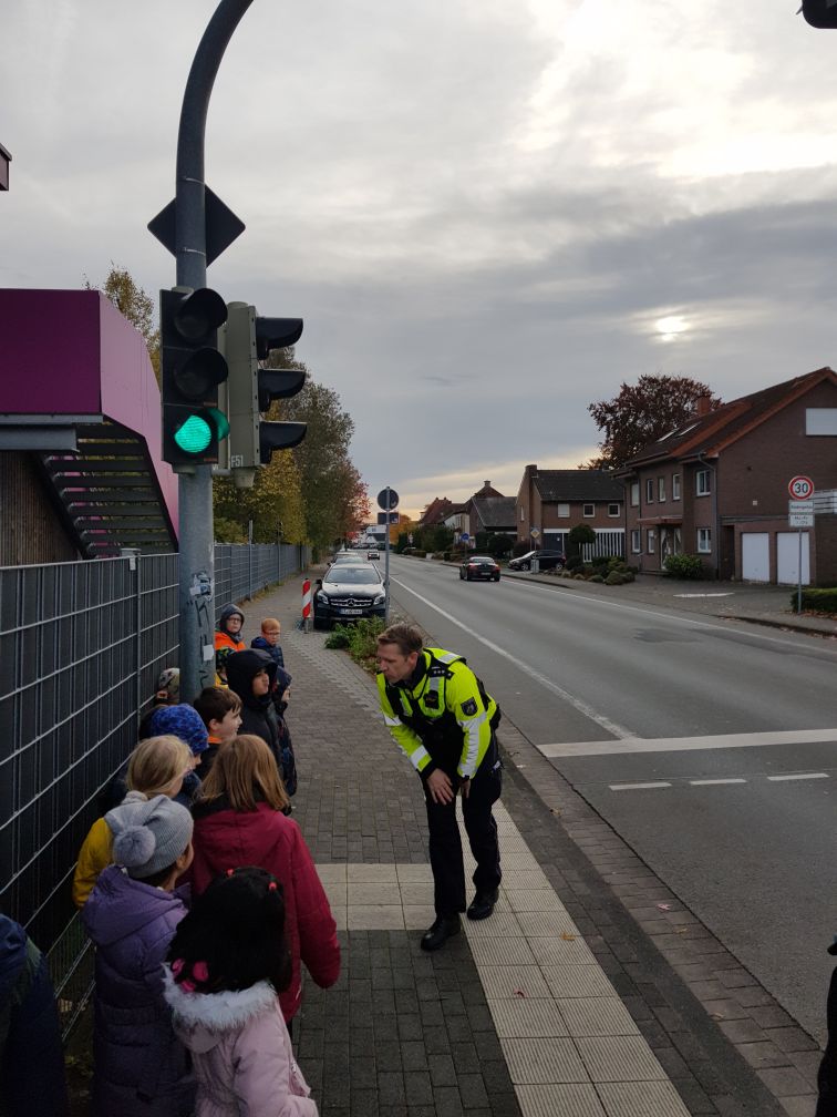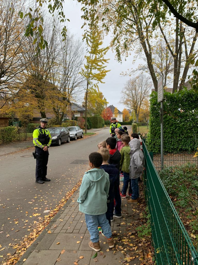 Zwei echte Polizisten besuchten die einzelnen JÜ-Klassen der Regenbogenschule. Sie erklärten den Kindern, wie sie sich im Straßenverkehr richtig verhalten, um sicher an ihr Ziel zu kommen. Nach einer kurzen Einführung und einem anschaulichen Versuch mit einem rohen Ei und einem Miniaturfahrradhelm (es gab KEIN Rührei), ging es in den echten Straßenverkehr. Die Kinder übten das Überqueren der Straße und lernten dabei den Merksatz: „Vor dem Bordstein heißt es halt, weil´s sonst knallt.“ An der Ampel hieß es: „Nicht rennen und nicht pennen“. Diese Regel eignet sich eigentlich für (fast) alle Lebenslagen… Ein großes Dankeschön an unsere beiden Polizisten. Die Kinder haben mit Freude viel für ihre Sicherheit gelernt!