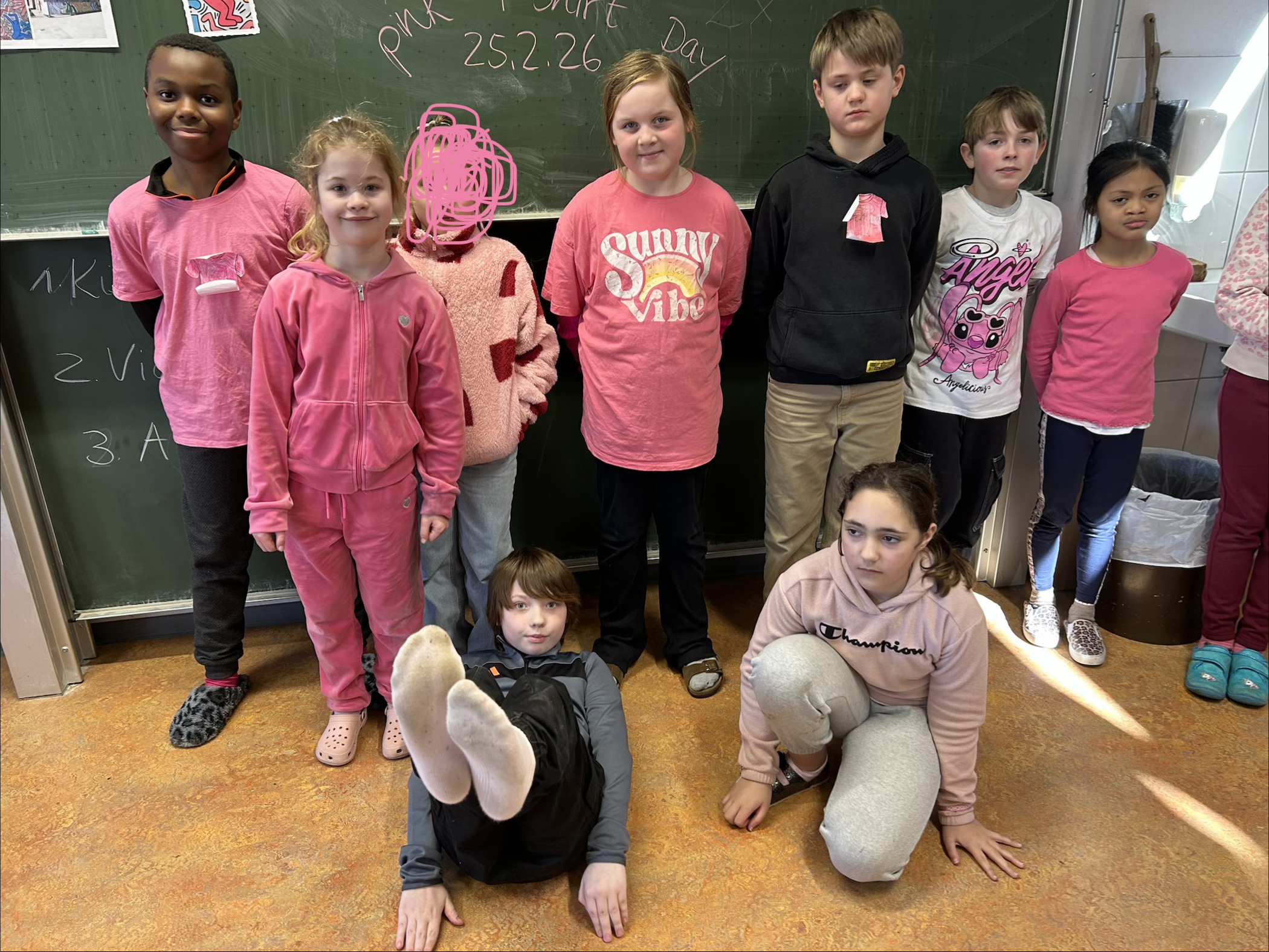 Heute, am 25. Februar, hat unsere Schule deutlich gezeigt, was uns wichtig ist: Zusammenhalt, Respekt und das sichere Gefühl, dazuzugehören. Mutig trugen alle als Zeichen dafür etwas Pinkfarbenes – von T-Shirts und Pullis über Haarspangen, Bändchen und Hosen bis hin zu Socken.