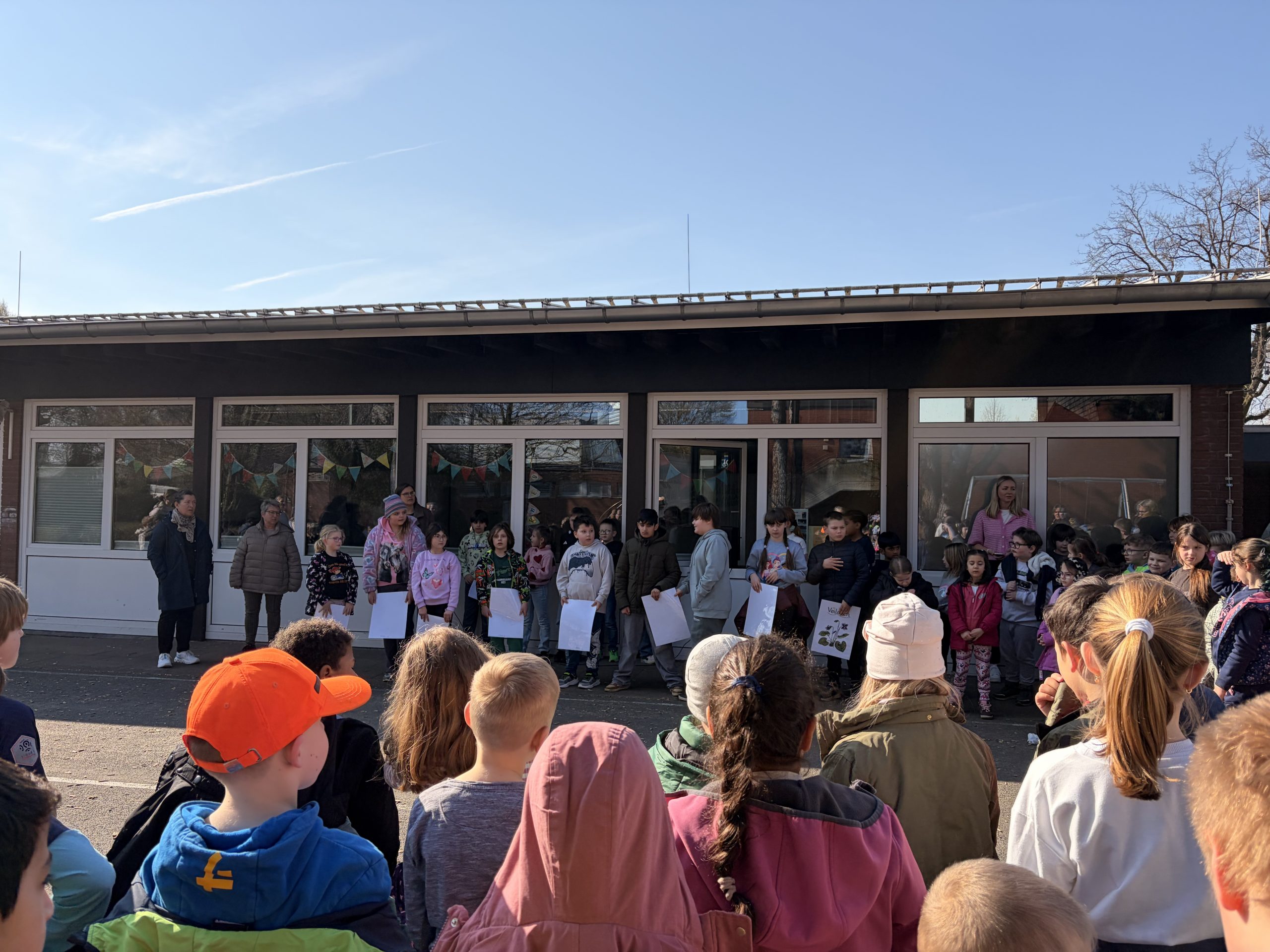 Am 23. März versammelte sich die gesamte Schulgemeinschaft der Regenbogenschule bei strahlendem Sonnenschein auf dem großen Hof zum gemeinsamen Jahreszeitensingen, um voller Vorfreude den Frühling